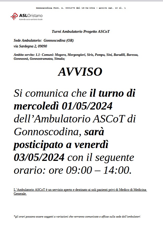 Si comunica che il turno di mercoledì 01/05/2024 dell'Ambulatorio ASCoT di Gonnoscodina, sarà posticipato a venerdì 03/05/2024 con il seguente orario: 09.00 - 14.00.