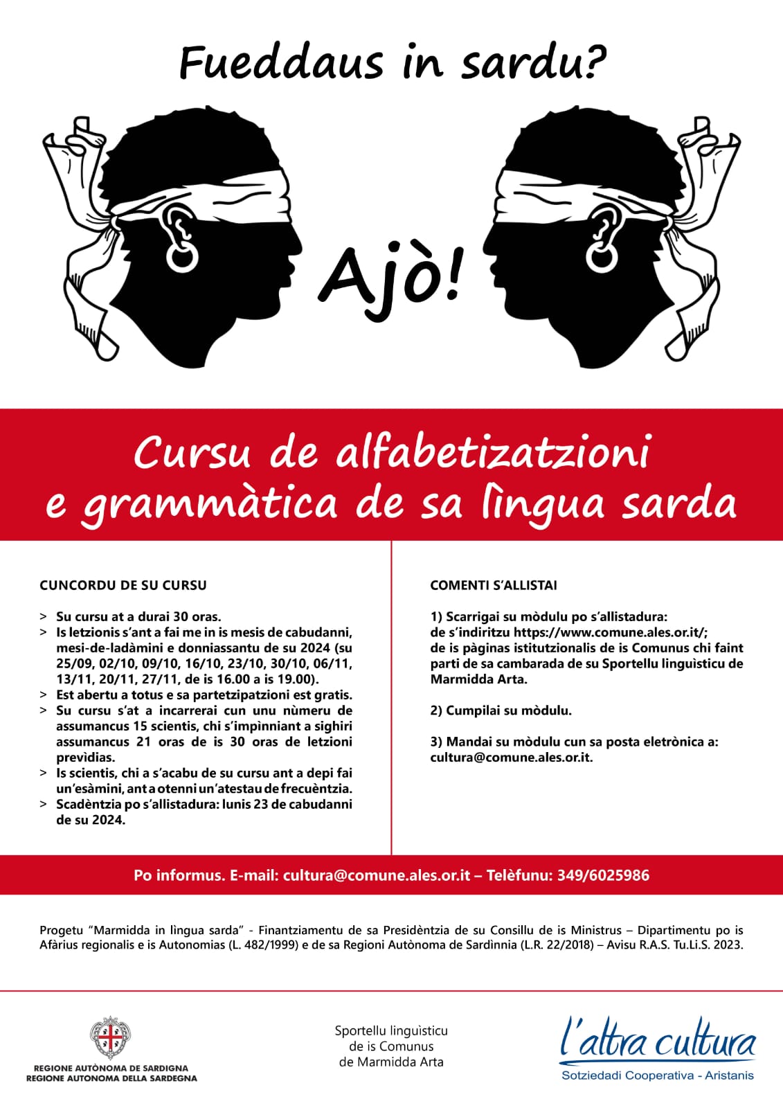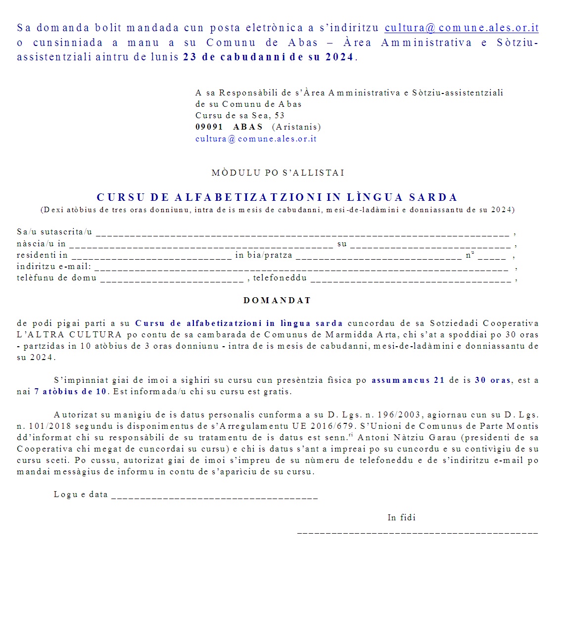 Si rende noto che sono aperte le iscrizioni al corso di alfabetizzazione in lingua sarda. Le domande dovranno essere inviate all'indirizzo cultura@comune.ales.or.it o a mano presso il comune di Ales, secondo le modalità indicate nella documentazione allegata.