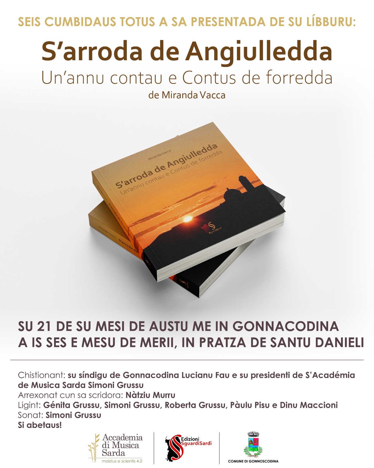 Si comunica che la presentazione del libro ""S'arroda de Angiulledda - Un'annu contau e Contus de forredda" di Miranda Vacca è anticipato alle ore 18.30 di giovedì 21 agosto 2025 presso il parco "San Daniele".