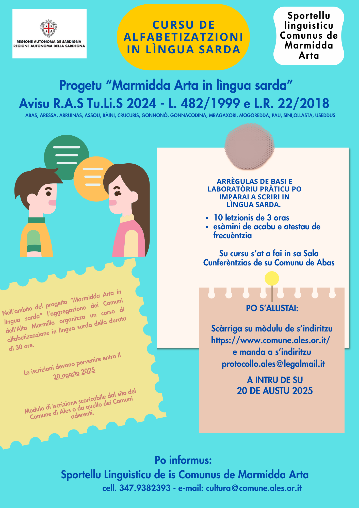 Si comunica che sono aperte le iscrizioni al corso di alfabetizzazione in lingua sarda organizzato dal Comune di Ales, capofila dell’aggregazione dei comuni dell’Alta Marmilla, in collaborazione con lo Sportello linguistico.