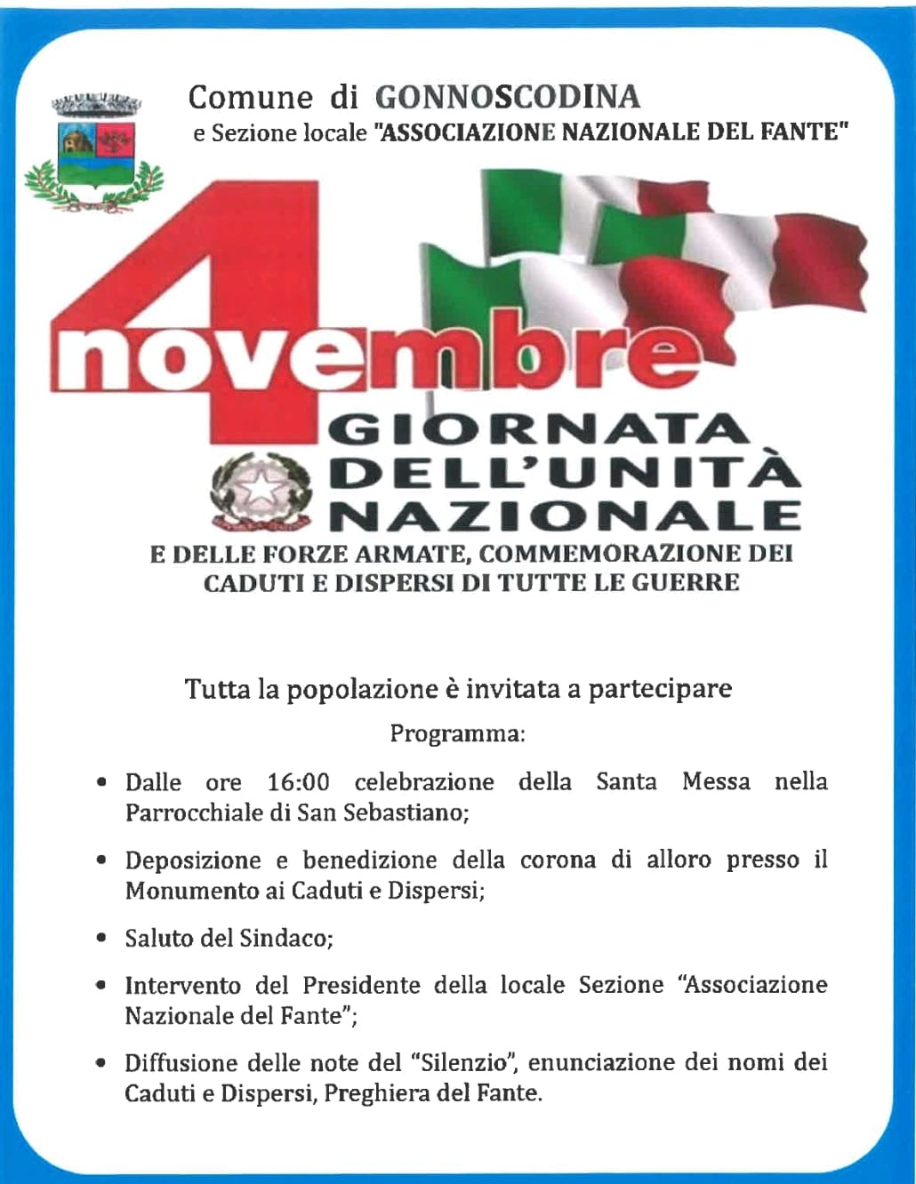 Il Comune di Gonnoscodina e la Sezione locale "Associazione Nazionale del Fante", invitano la popolazione alle celebrazioni che si terranno il 4 Novembre 2025 in occasione della giornata dell'Unità Nazionale, delle forze armate, commemorazione dei caduti e dei dispersi di tutte le guerre.