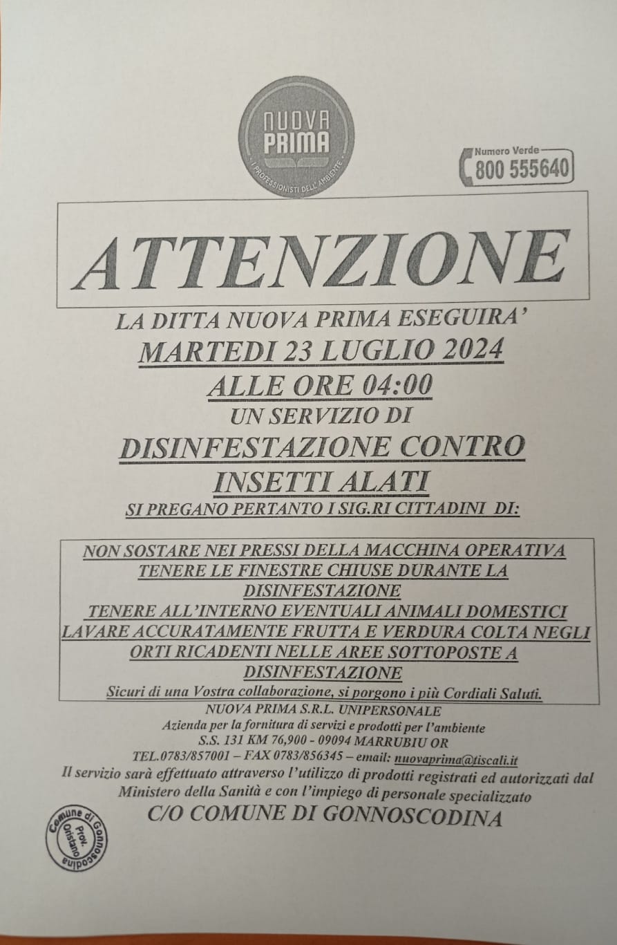 Si informa la popolazione che il giorno Martedì 23 lugloo 2024 a partire dalle ore 04:00 è prevista la disinfestazione contro insetti alati e striscianti.